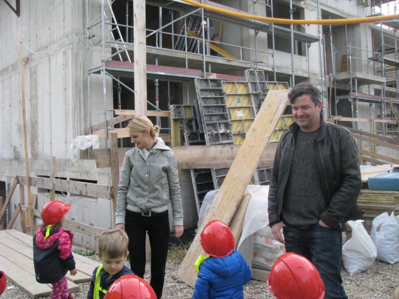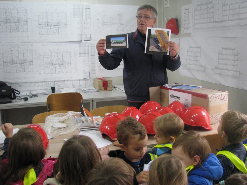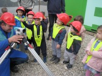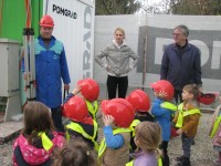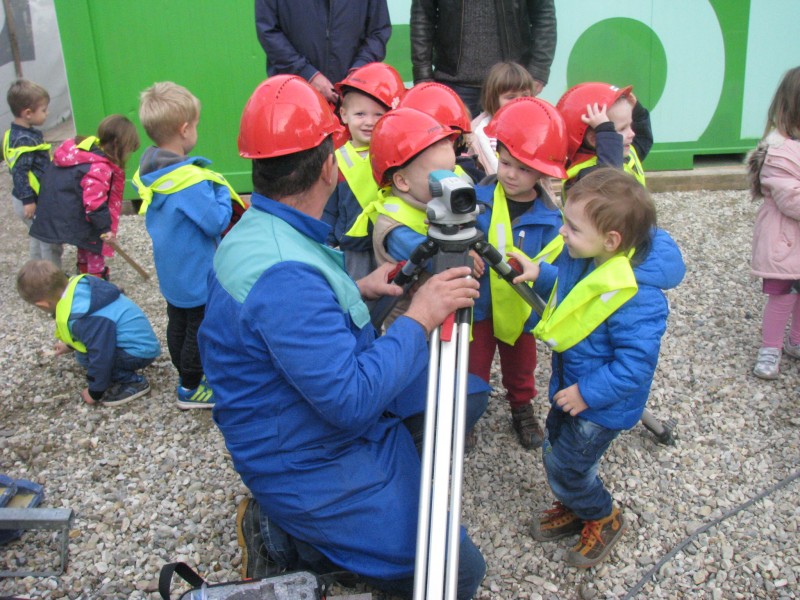 Ogledali smo si gradbišče, spoznali novo okolje, poklice,prisluhnili nazorni predstavitvi dejavnosti in preizkusili, kako zadeve delujejo- seveda s čeladami.