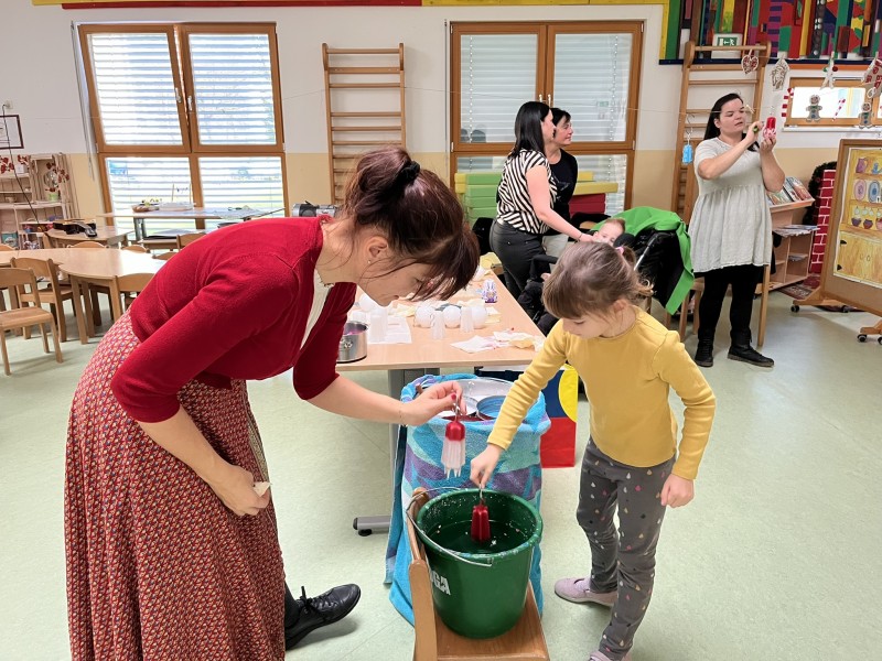 Veseli december smo si polepšali s praznično čajanko. Mamica Valentina nam je pripravila slastne božične kolačke. Mamica Eva je edina v Sloveniji, ki se ukvarja z rezljanjem sveč. Tehniko nam je najprej pokazala, nato pa si je vsak izdelal svojo svečko. Na koncu smo se posladkali s kolački.