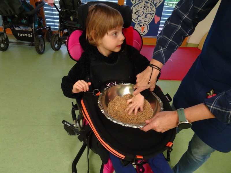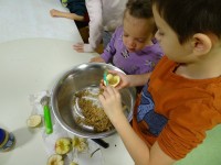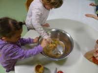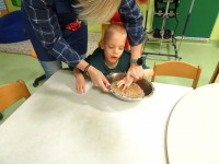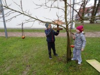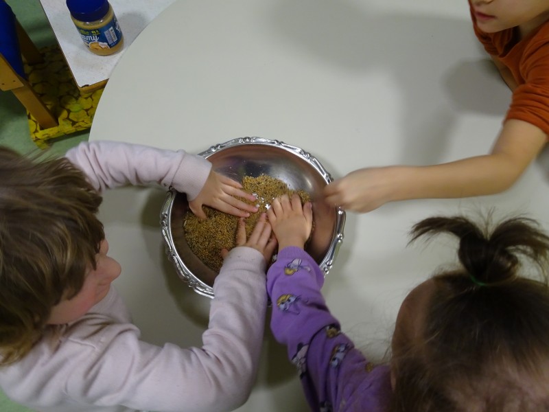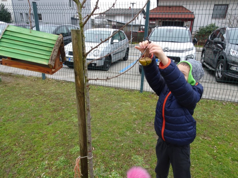 Zimski čas je namenjeni počitku narave, za živali, ki zime ne prespijo ali odletijo v tople kraje se začne iskanje hrane. Zato smo se odločili, da ptičkom, katere opazujemo vsak dan, naredimo »ptičje pogačke«. Proso in arašidovo maslo smo najprej spoznali senzorno – tipali, okušali, vonjali. Jabolka smo izdolbli in vanje napolnili mešanico prosa in arašidovega masla. Ptičje pogačke smo nato obesili na drevesa, do bomo lahko opazovali ptice…