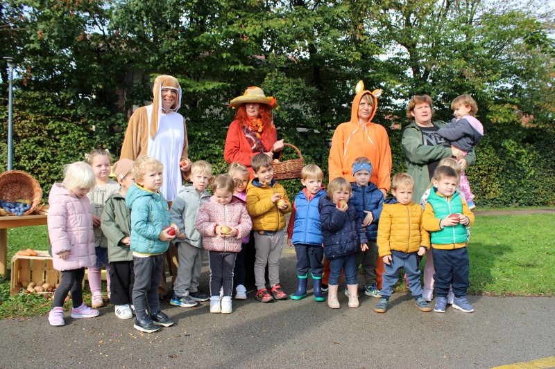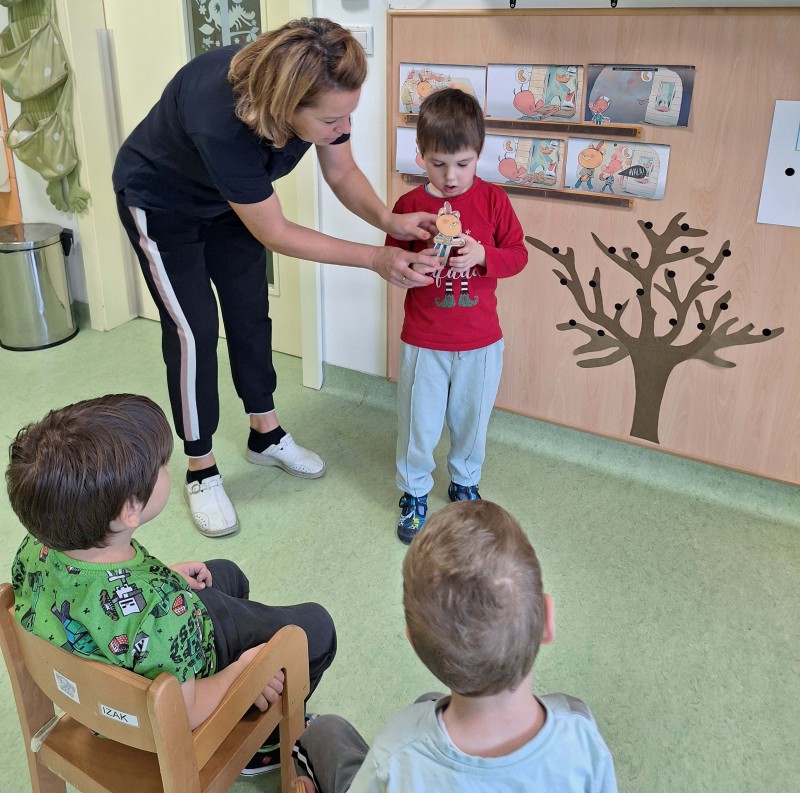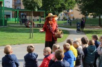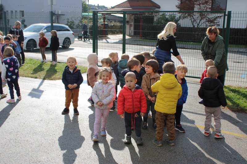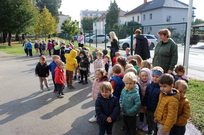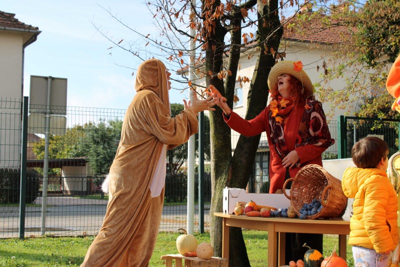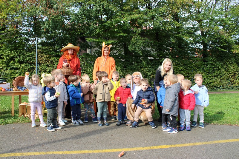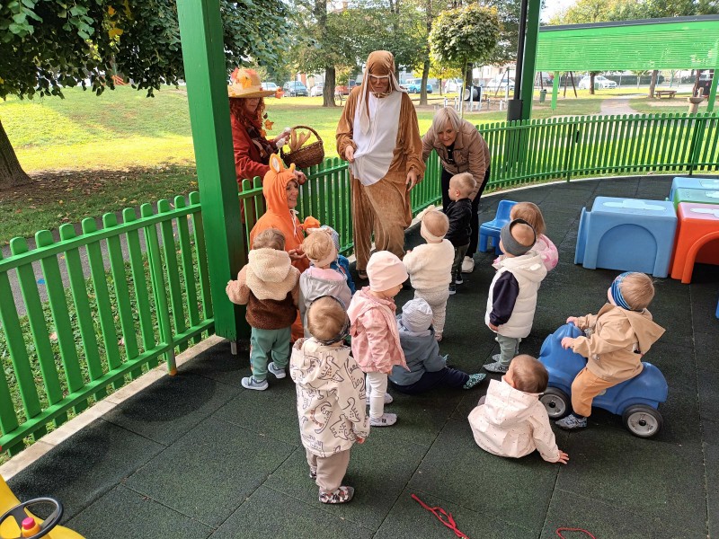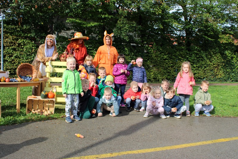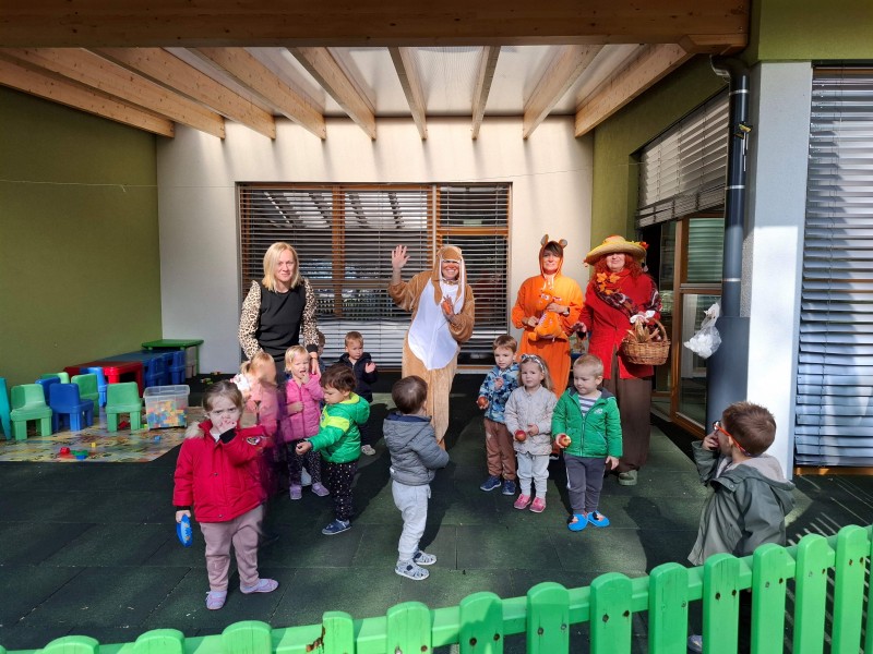 Prav posebej smo bili presenečeni, ko nas je obiskala Teta Jesen z zajčkom in lisjakom. Tudi zajček in lisjak sta nas spomnila, kako pomembno je biti prijazen in reči: PROSIM in HVALA. Teta Jesen pa je vsakemu otroku podarila še sladko, rdeče jabolko.