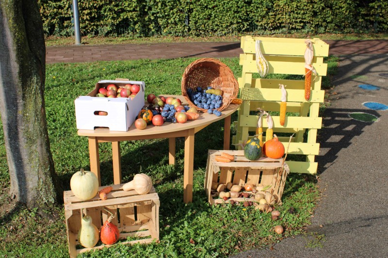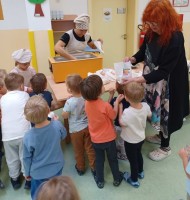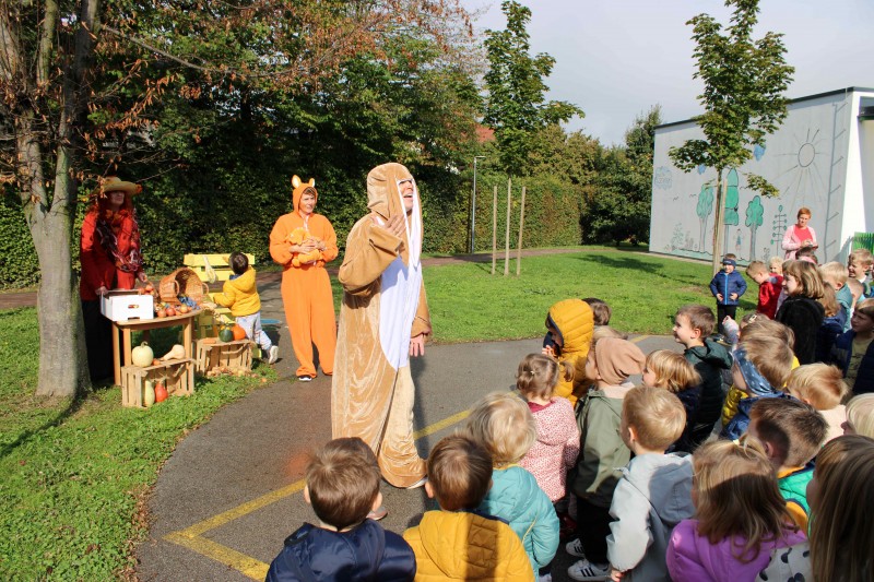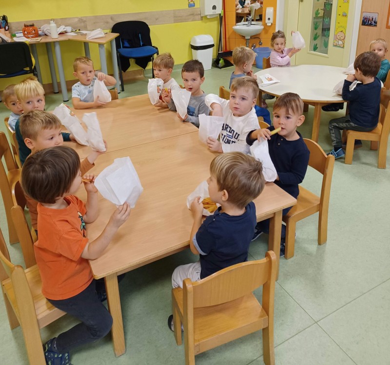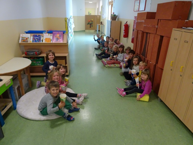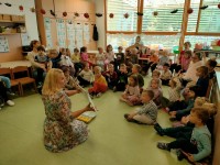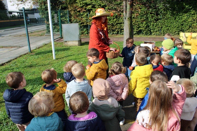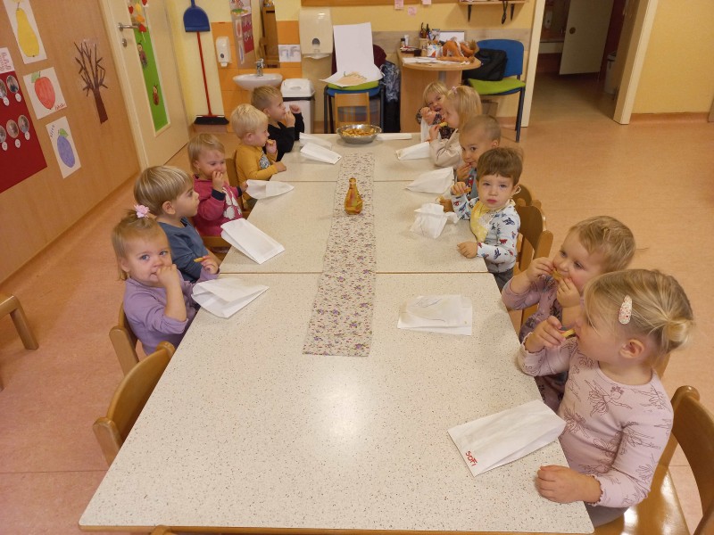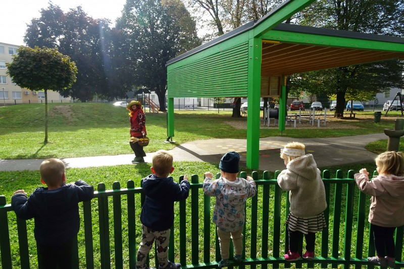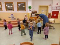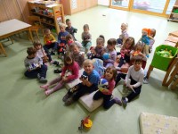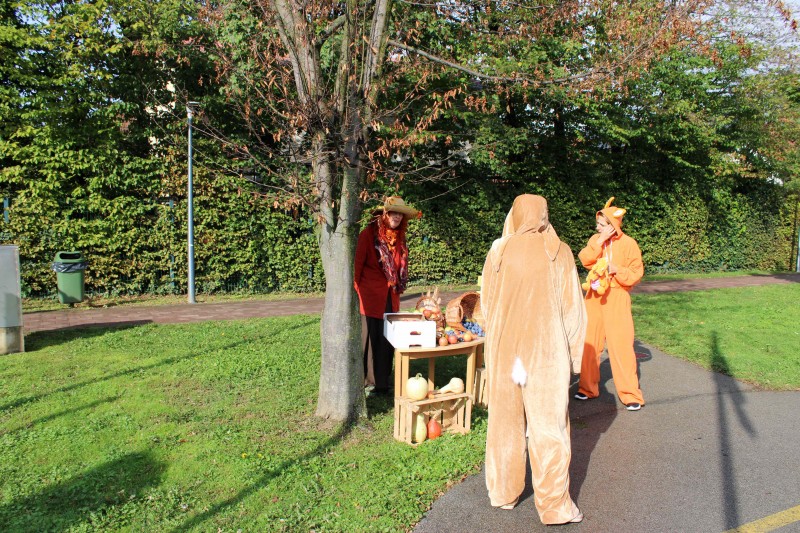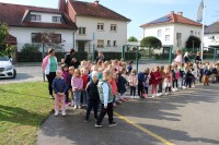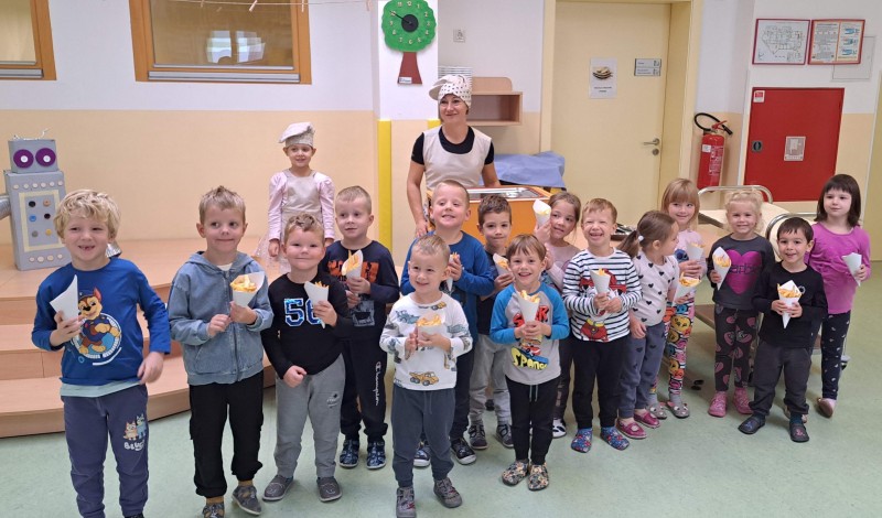 Prav posebej smo bili presenečeni, ko nas je obiskala Teta Jesen z zajčkom in lisjakom. Tudi zajček in lisjak sta nas spomnila, kako pomembno je biti prijazen in reči: PROSIM in HVALA. Teta Jesen pa je vsakemu otroku podarila še sladko, rdeče jabolko.