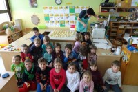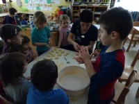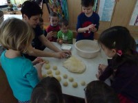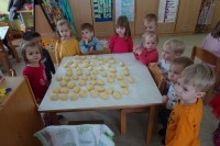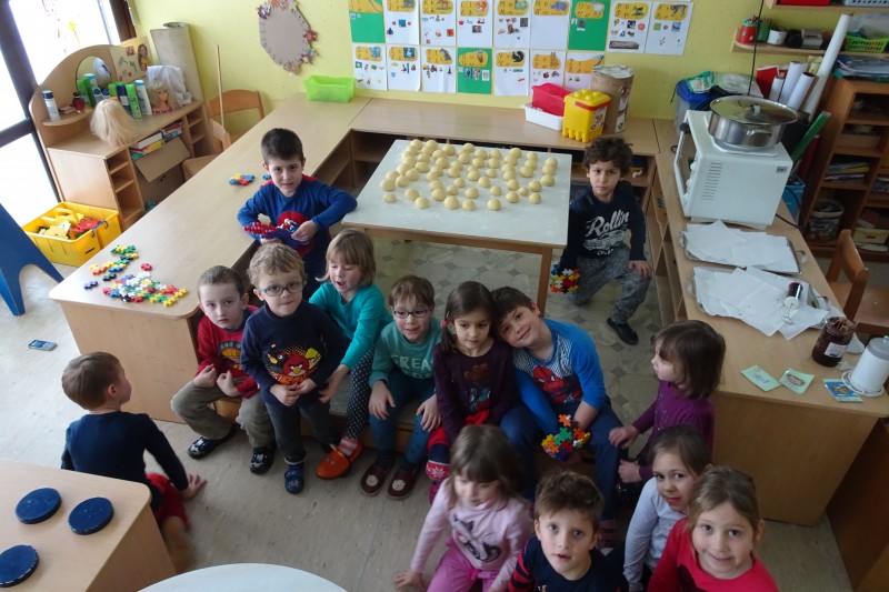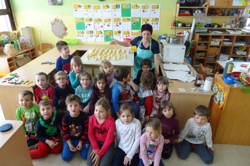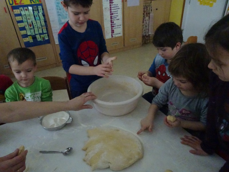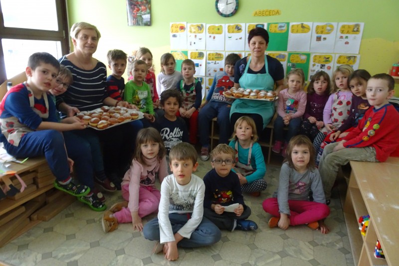 Otroci so najprej spoznali sestavine, jih poimenovali, tudi poskusili in pomagali pri gnetenju tako, da so dodajali sestavine. Opazovali so vzhajanje testa kako je naraslo, nato pa se preizkusili v oblikovanju kroglic, kar je bilo zelo zanimivo. Kroglice so bile majhne vendar so se otroci čudili ko so postajale vedno večje. Še bolj zanimivo pa jim je bilo, ko so se krofi cvrli in dobivali »vence« kot mi pravimo. Najslajše pa je bilo, ko so jih lahko pojedli – Hm, kako dobri so bili, sladki, mehki, še topli…