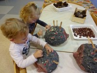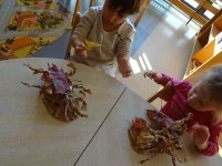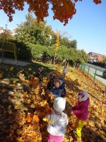 V skupini 2-3 let smo se podali v doživljanje, odkrivanje in raziskovanje jeseni in njenih darov. Igrali smo se z jesenskimi plodovi in barvitimi listi. Najbolj pa smo se razveselili obiska. Izpod listja je pokukal ježek. Bili smo tako navdušeni, da smo mu zapeli pesmico.