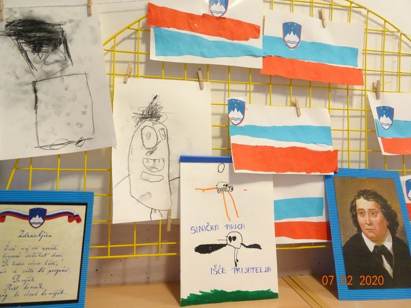 V dneh do prihajajočega slovenskega kulturnega praznika smo z vsakodnevnimi dejavnostmi in s prireditvami počastili spomin na našega največjega pesnika, Franceta Prešerna. Otroci so se pod mentorstvom svojih vzgojiteljev izražali na vseh področjih. Pogovarjali smo se o državnih praznikih in spoznali državne simbole ter tako otroke spodbujali k domovinski vzgoji. Skozi igro smo z jezikom ter likovno in glasbeno umetnostjo spoznavali pesnika in njegova dela.