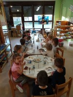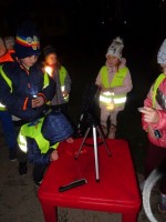 V petek, 19.11.2021, je končno prišel dan, ko smo se v popoldanskih urah vrnili s prtljago nazaj v vrtec ter tukaj prespali. Otroci so bili tako neučakani, da so že ves teden samo odštevali dneve ter se z velikim nasmeškom vrnili nazaj. Niti ni bilo časa za poslavljanje, saj so nas že čakale delavnice povezane z vesoljem. Ko smo se posladkali s palačinkami, se uredili, vzeli svetilke, smo se odpravili na nočni pohod po mestu. S teleskopom smo si še ogledali zvezde in polno luno, nato pa umili zobke, oblekli pižame in že bili pripravljeni na ples v pižamah. Po pestrem dogajanju smo ob risanki sladko zaspali. Zjutraj pa je zelo hitro prišla ura, ko je bil čas za odhod domov. Imeli smo se lepo, se zabavali in bili zelo pogumni. Seveda je sledilo vprašanje »Gda zaj pa spijmo v vrtce?«.