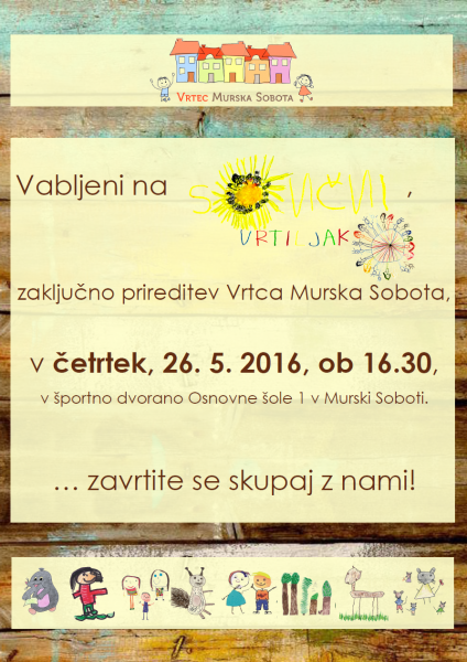 vabimo vas na Sončni vrtiljak, zaključno prireditev Vrtca Murska Sobota, v četrtek, 26. 5. 2016, ob 16:30, v športno dvorano Osnovne šole I v Murski Soboti.