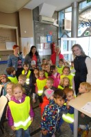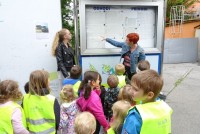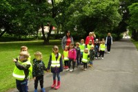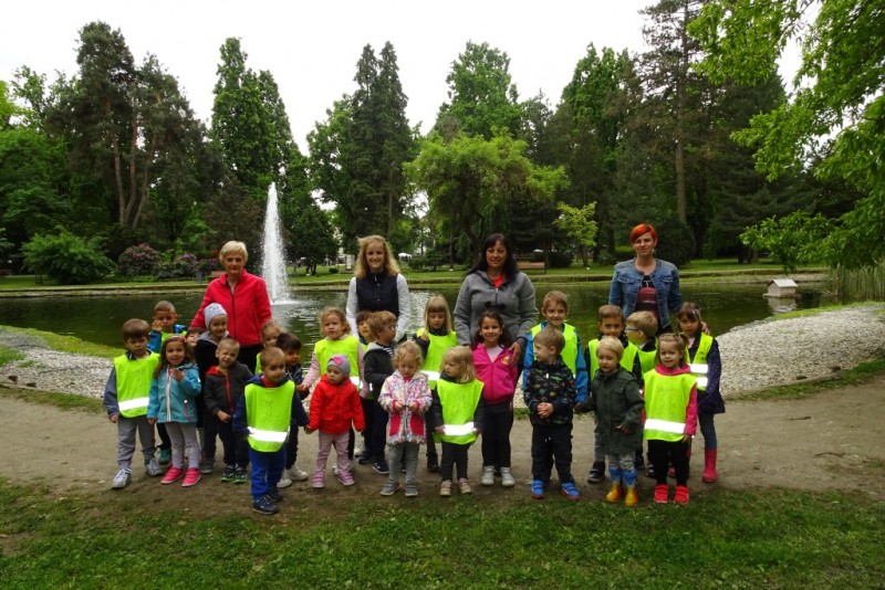 Starejši otroci so spremljali mlajše, na njihovem prvem sprehodu po mestu. Pot nas je vodila do mestnega parka, kjer smo opazovali ribnik in živali ob njem.