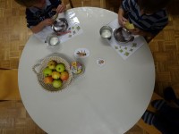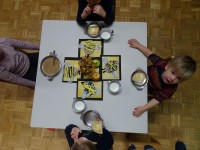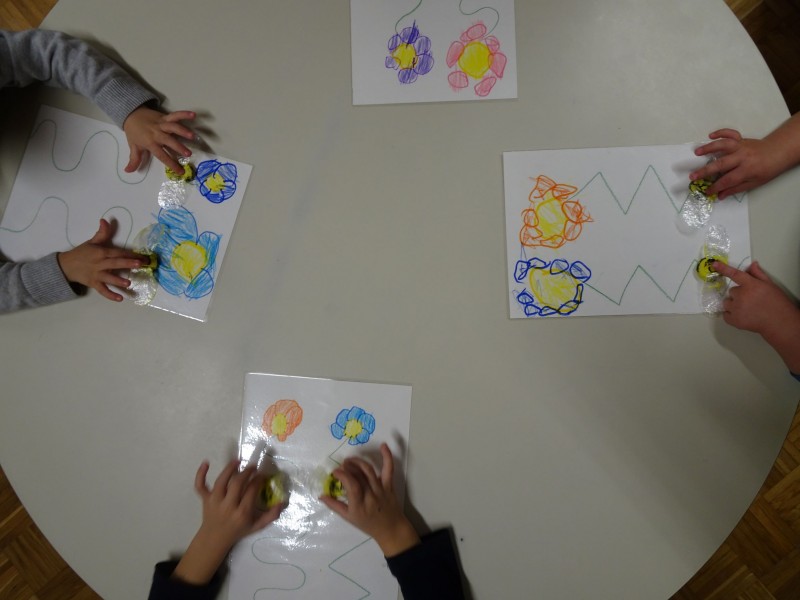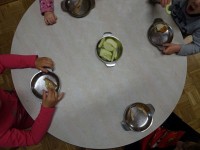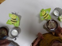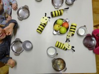 Prisluhnili smo pravljicam, peli pesmi, ustvarjali čebele in ob zaključku tedna smo se sladkali z medom in drugimi lokalno pridelanimi dobrotami (maslo, mleko, kruh, jabolko). Želimo si, da bi bil tradicionalni slovenski zajtrk na jedilniku čim večkrat, saj s tem spodbujamo uporabo hrane iz lokalnega okolja.