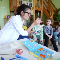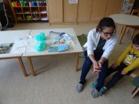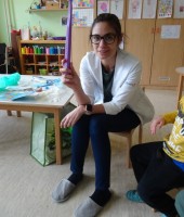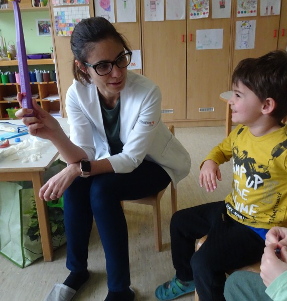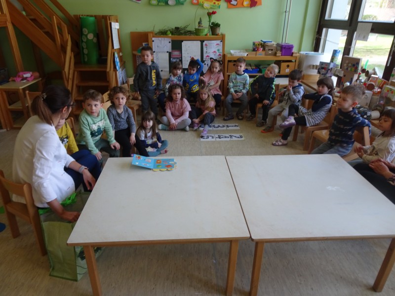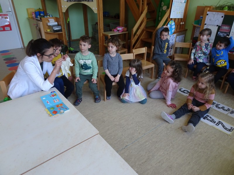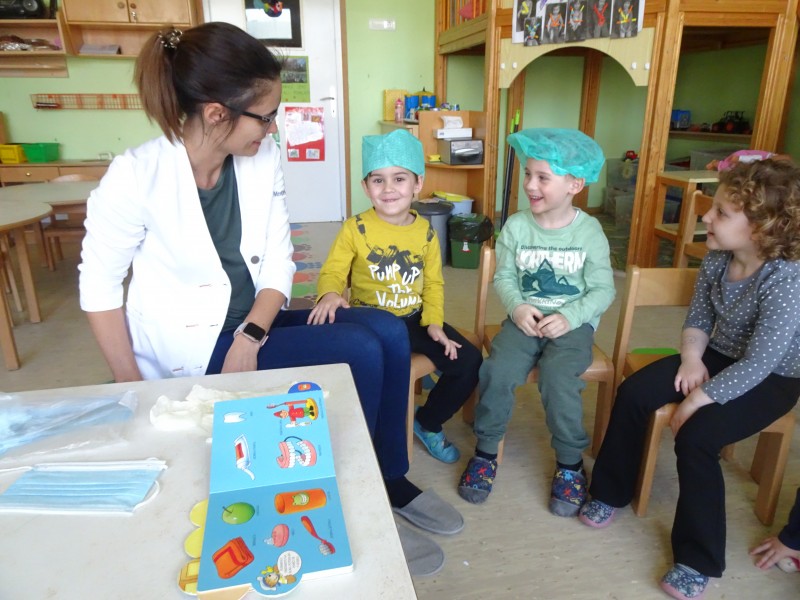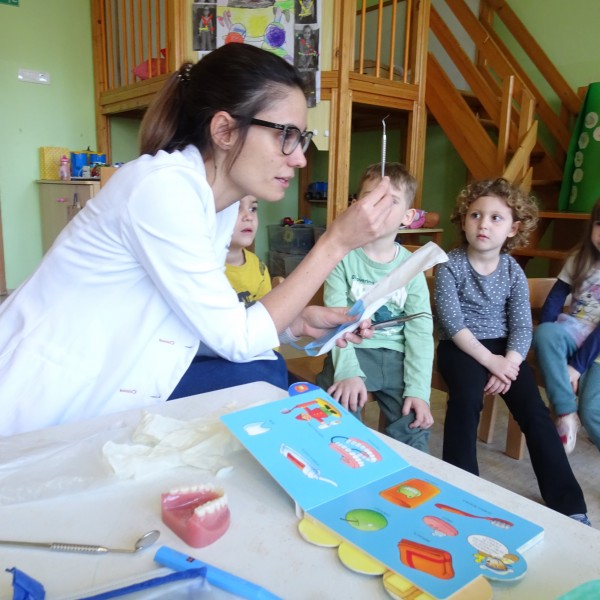 Imeli smo poseben obisk, saj nas je obiskala mamica iz oddelka, ki je zobozdravnica. Predstavila je svoj poklic in nam pokazala pripomočke, ki jih uporablja pri svojem delu. Preko zgodbe je pritegnila otroke in jih spodbudila k vsakodnevnemu ščetkanju zob. Na fotografijah je vidno, kaj vse nam je pokazala.