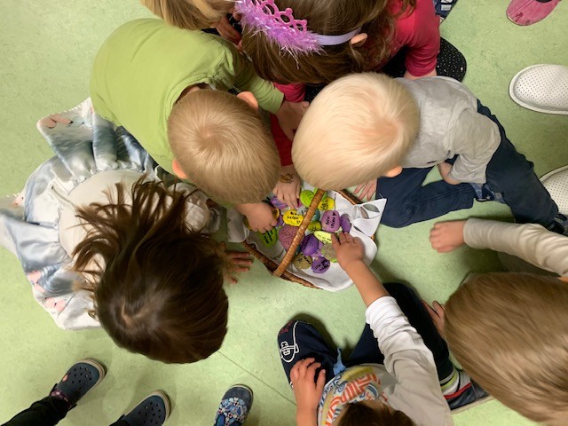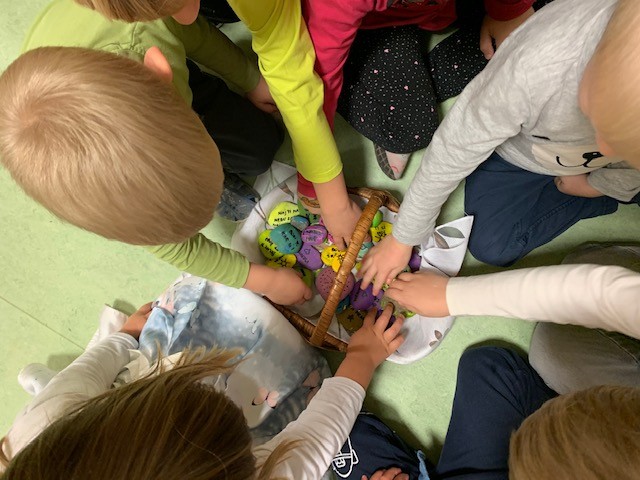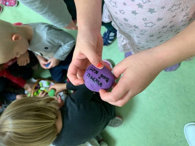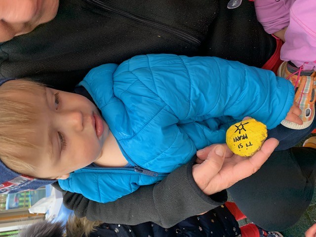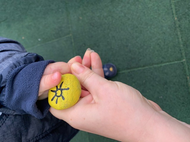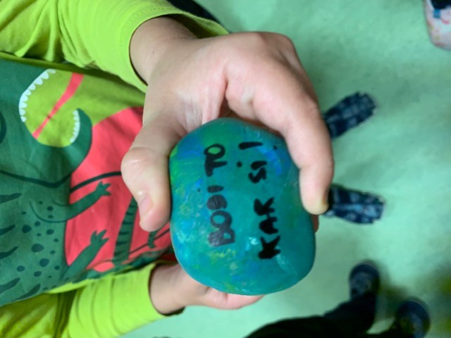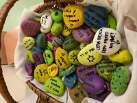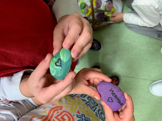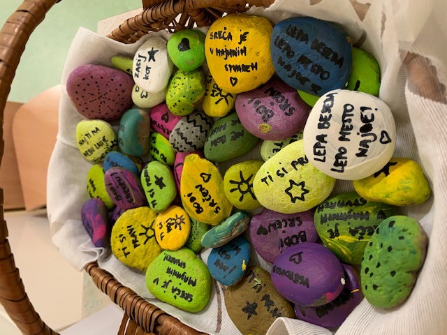 Nabrali smo kamenčke, jih pobarvali ter jim dodali lepe in prijazne misli. Kamenčke smo podarili po enoti Gozdiček in jih razdelili staršem otrok iz skupine.