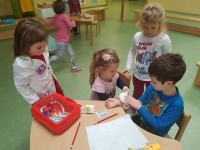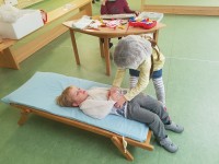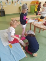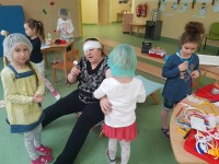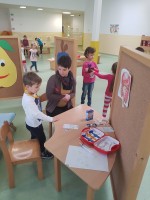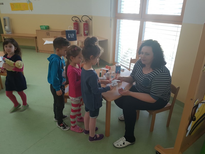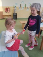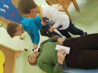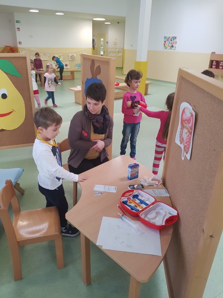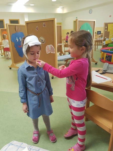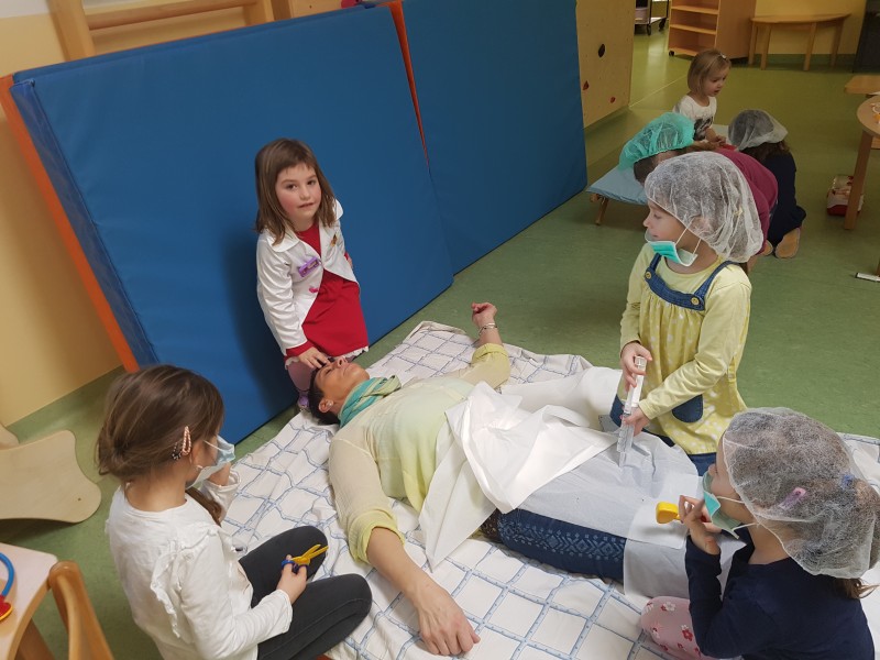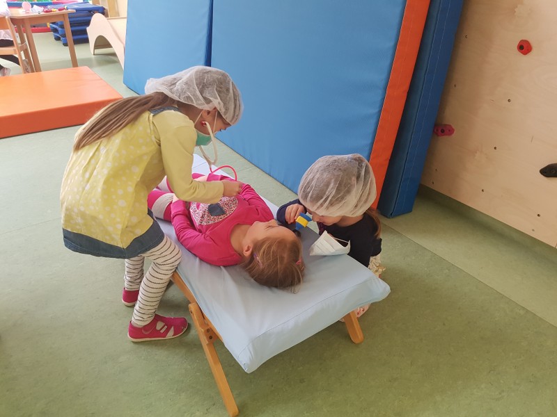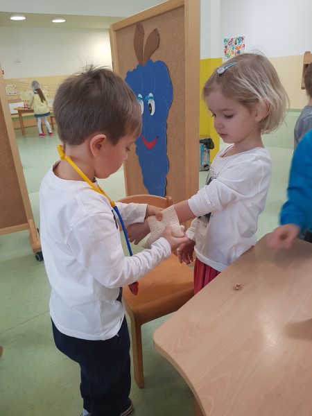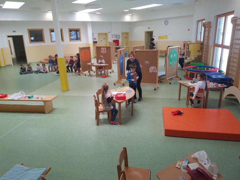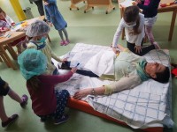Naša telovadnica se je za nekaj časa spremenila v pravo bolniščnico. Bili smo zdravniki, medicinske sestre, bolniki, ...Tudi "pacientov" smo imeli veliko in so kar nekaj časa čakali v čakalnicah, da so jih naši zdravniki pregledali. Imeli smo se lepo in smo poklice zares dobro spoznali.