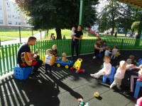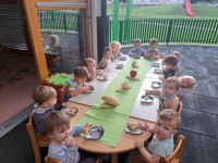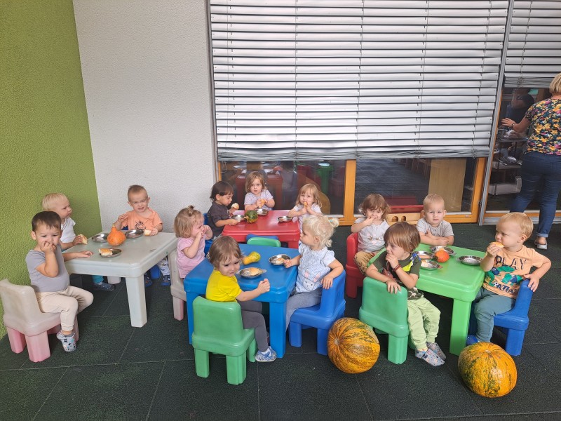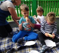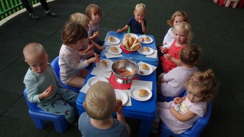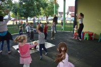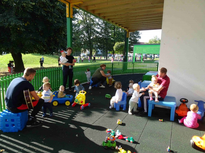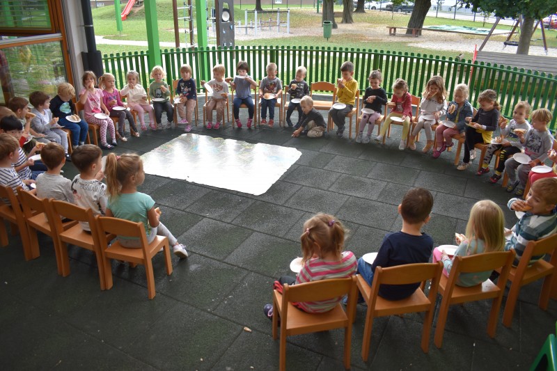 Na terasah vrtca smo pripravili piknik s hrenovkami. Na pikniku pa seveda ne sme manjkati tudi glasba in ples.