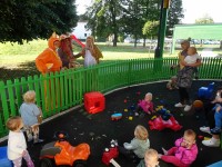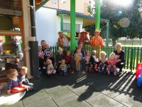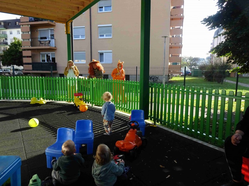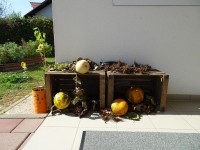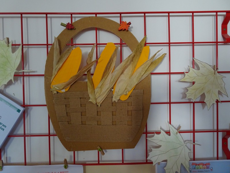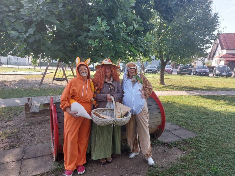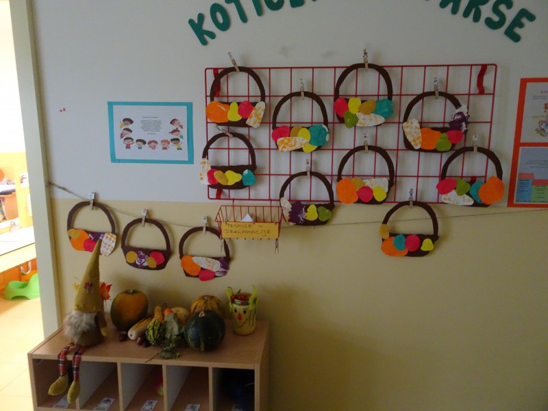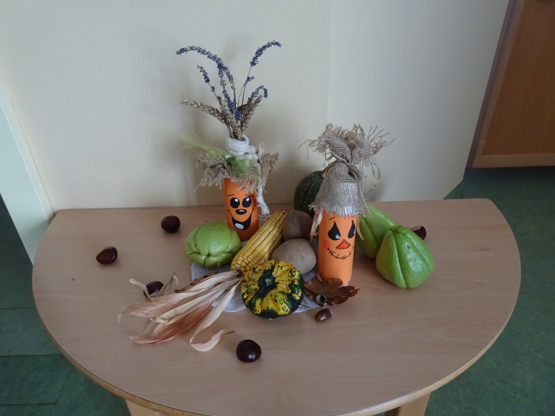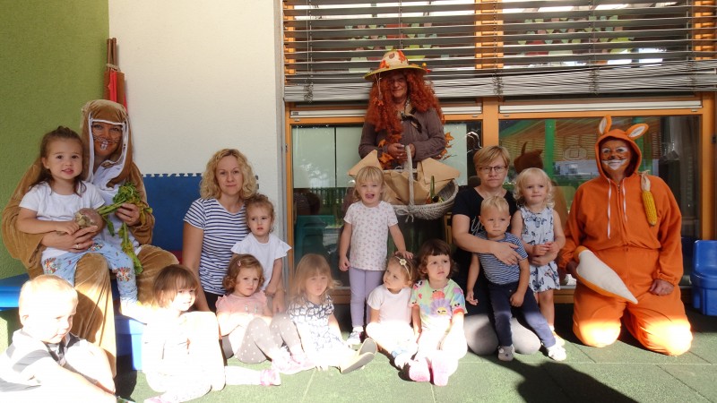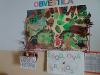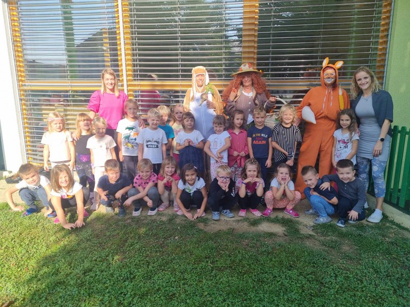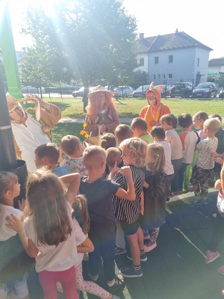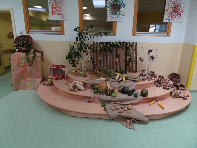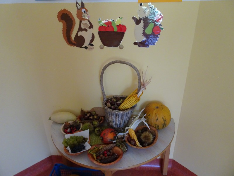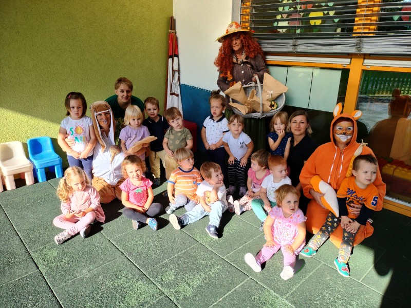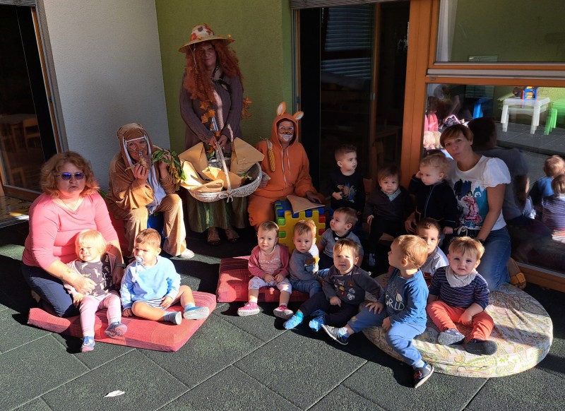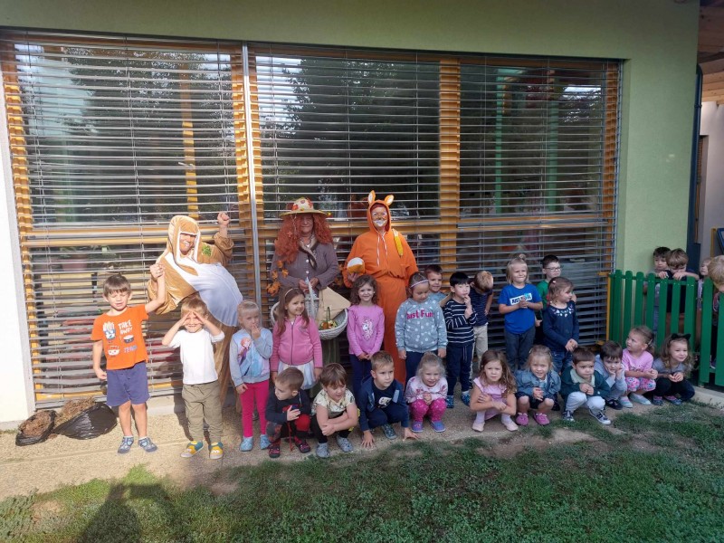 Danes nas je obiskala tetka Jesen, zajček in lisička s polno košaro suhega sadja. Otroci so se jih zelo razveselili. Skupaj smo zapeli pesmi, se poveselili in si ogledali razstavo jesenskih pridelkov.