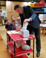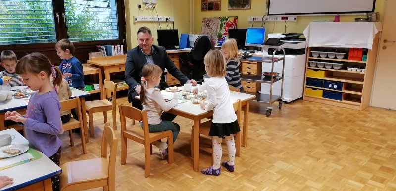 Otrokom v Vrtcu Murska Sobota – enota Miške, sta se danes na Tradicionalnem slovenskem zajtrku pridružila župan Mestne občine Murska Sobota Damjan Anželj in ravnatelj Vrtca
