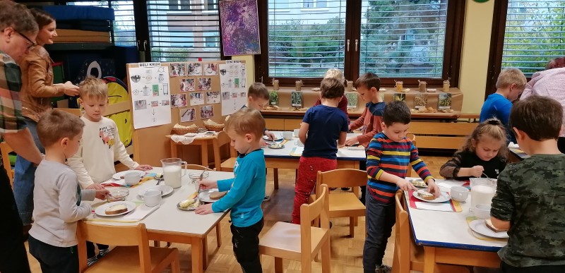 Danes, 17 novembra 2023 je v vrtcu potekal Tradicionalni slovenski zajtrk. Letošnji slogan je »Kruh za zajtrk – super dan!«. Današnji dan je namenjen ozaveščanju o pomenu kruha, žita, doma pridelane hrane, njenemu uživanju in poudariti pomen zajtrka, kot pomembnega dnevnega obroka za zdrav način življenja in prehranjevanja.