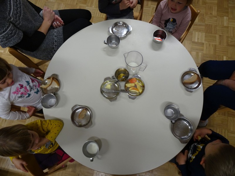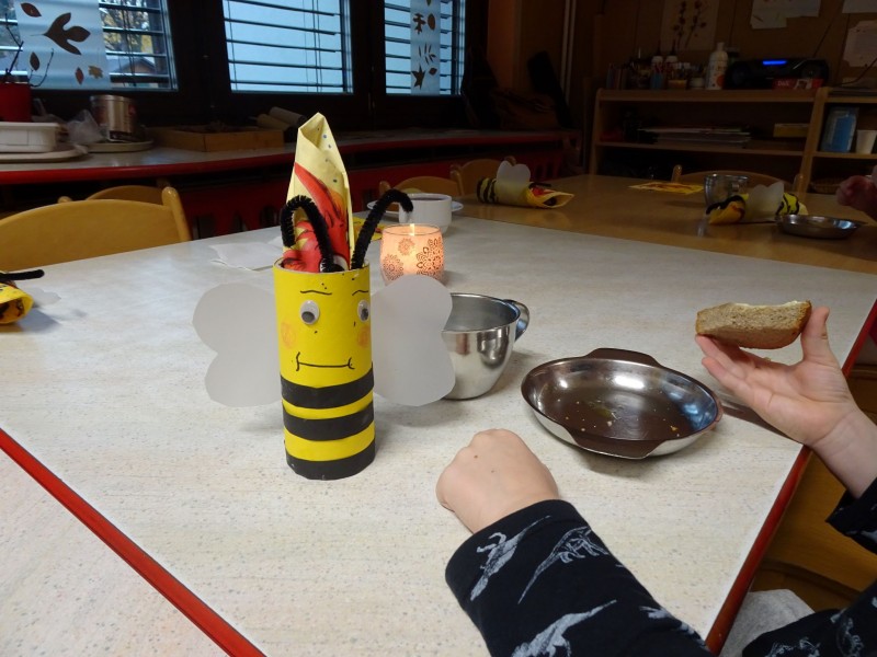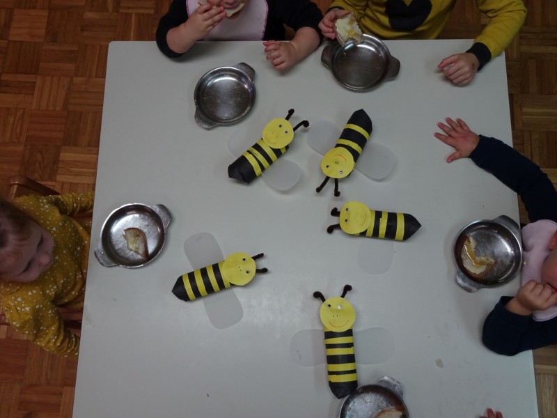 Prisluhnili smo pravljicam, peli pesmi, ustvarjali čebele in ob zaključku tedna smo se sladkali z medom in drugimi lokalno pridelanimi dobrotami (maslo, mleko, kruh, jabolko). Želimo si, da bi bil tradicionalni slovenski zajtrk na jedilniku čim večkrat, saj s tem spodbujamo uporabo hrane iz lokalnega okolja.