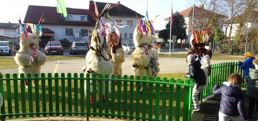 Z zvonci za pasom pleše do vrat, ljubi otroci ne se ga bat. Kurent, kurent hojlara je prijazna maškara...