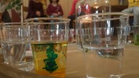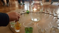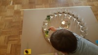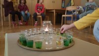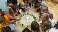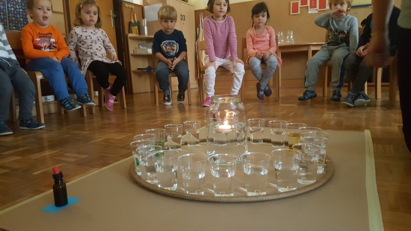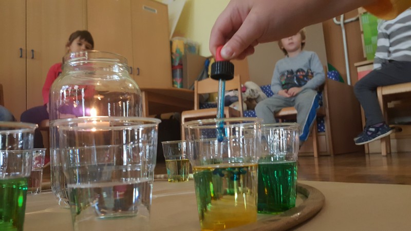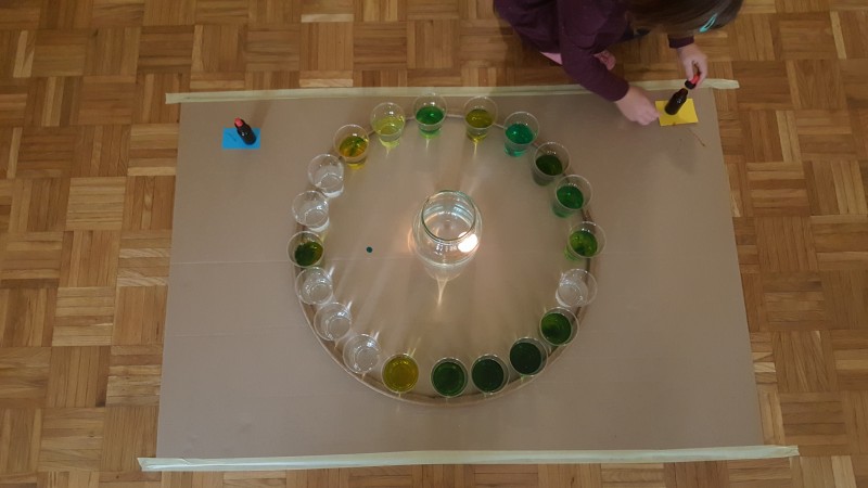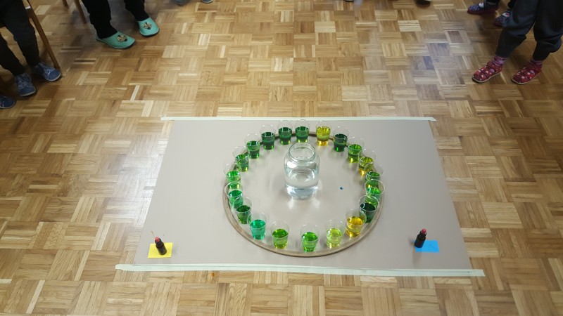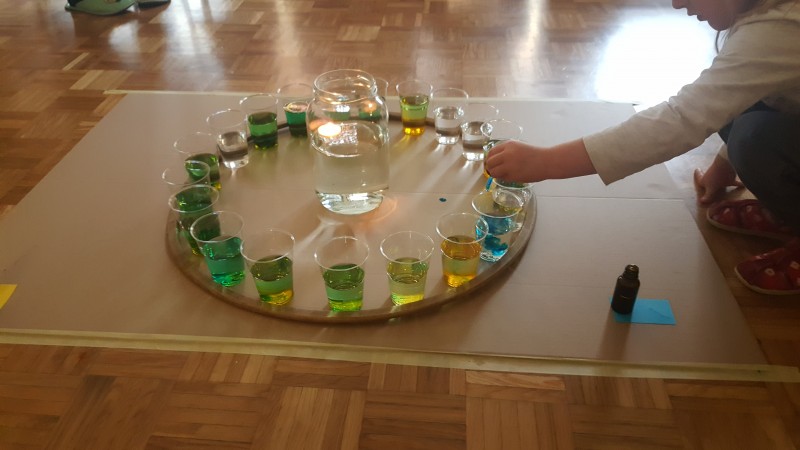 Vsak list, preden se obarva v jesenske barve, drevo krasi z zelenimi listi in prav ti zeleni listi so nas vodili k raziskovanju zelene barve. Izziv se pojavi šele takrat, ko imaš pred seboj dve barvi, ti pa potrebuješ tretjo, ki je ni. Ne ostane ti nič drugega kot to, da ti dve barvi pomešaš in počakaš kaj se bo zgodilo. V iskanju zelene barve, smo v kozarcu vode skušali pomešati kapljice modre in kapljice rumene barve, rezultat je bila zelena barva v dvajsetih odtenkih.