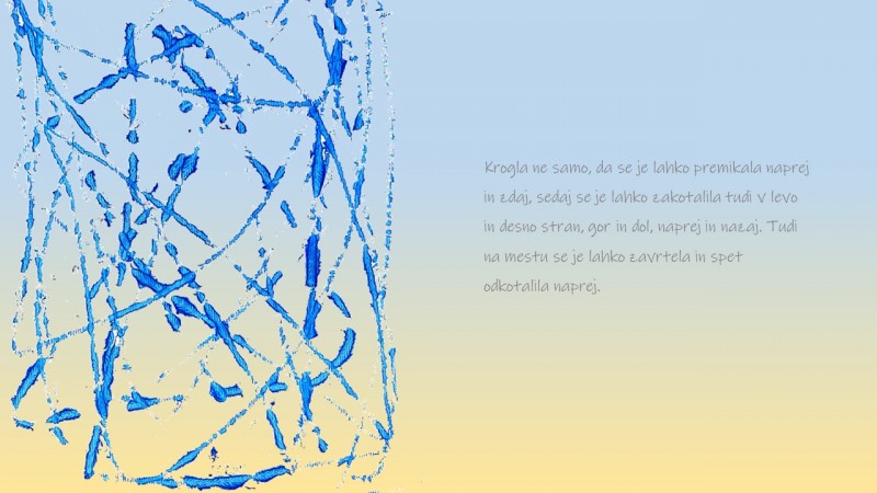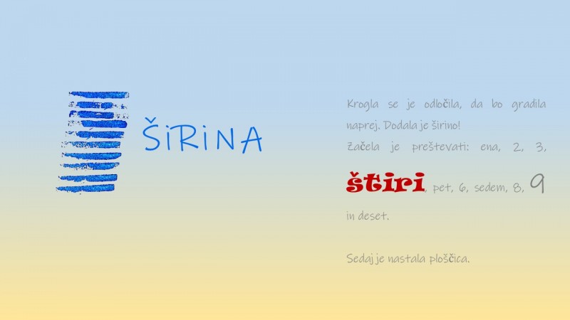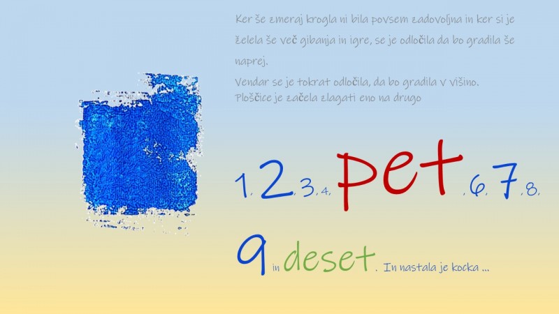 Točka je postala osnovni gradnik s katerim je krogla gradila, najprej dolžino, nato širino in ob koncu dodala še višino. Preštevala je do deset, tako dolgo, da je na koncu nastala še kocka, v katero se je naša razigrana krogla lahko tudi skrila.