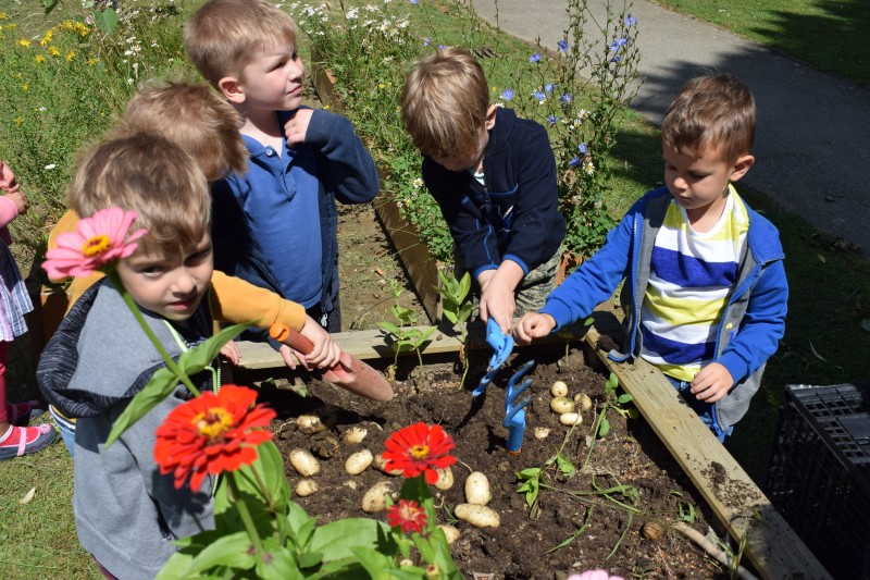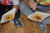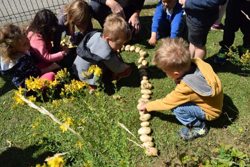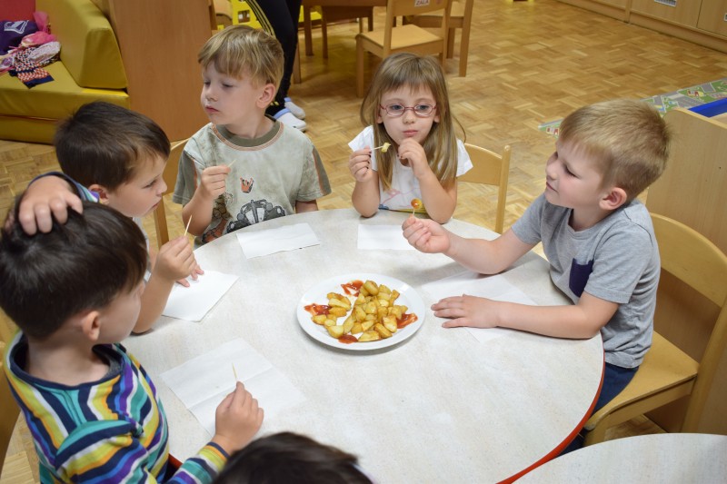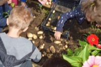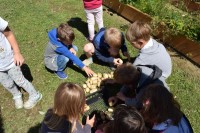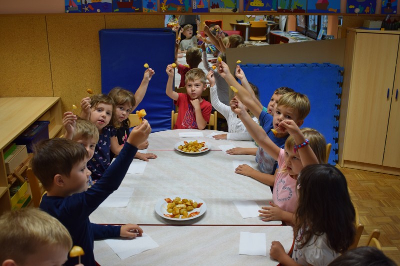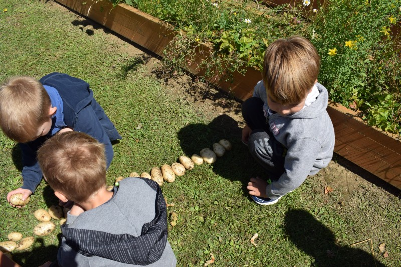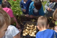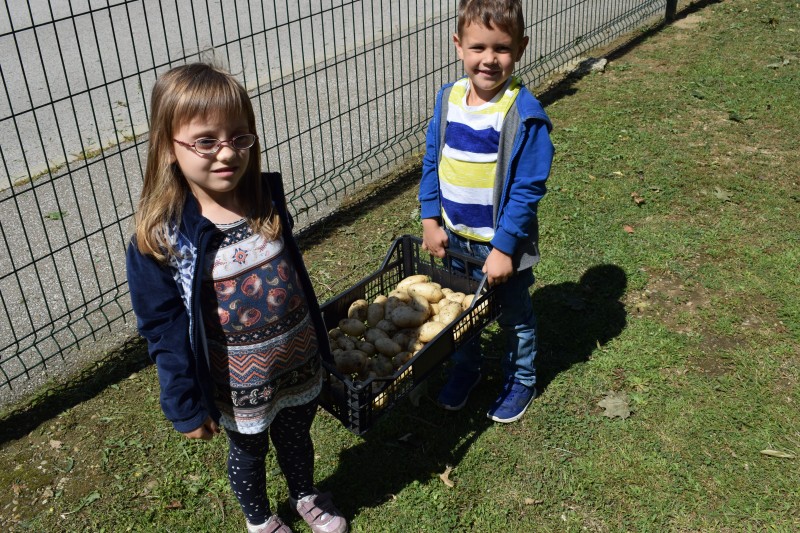 Krompir na naši visoki gredici je bogato obrodil. Otroci so si zaželeli  piknik, zato so nam v kuhinji priskočili na pomoč. Ker ga je bilo veliko, smo ga delili s prijatelji iz sosednje igralnice.