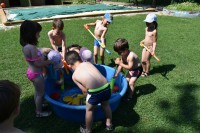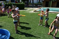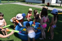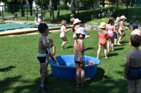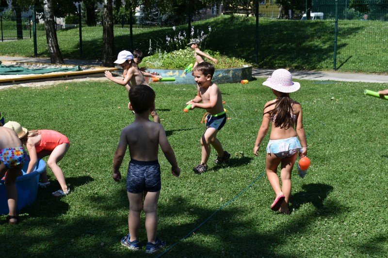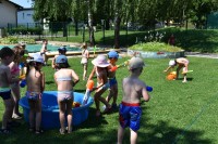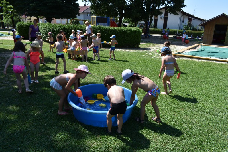Dneve pred težko pričakovanimi počitnicami si krajšamo z dejavnostmi pripravljenimi na igrišču vrtca. Ena izmed najbolj ljubih otrokom je voda v kateri otroci neizmerno uživajo.