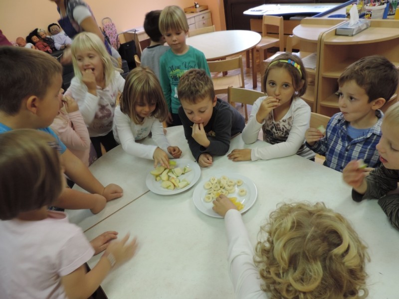 We already know the fruit: an apple, a pear, a banana, a plum, an orange, a watermelon, a strawberry and they all taste very good. We are not hungry anymore.
