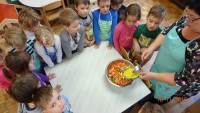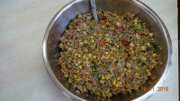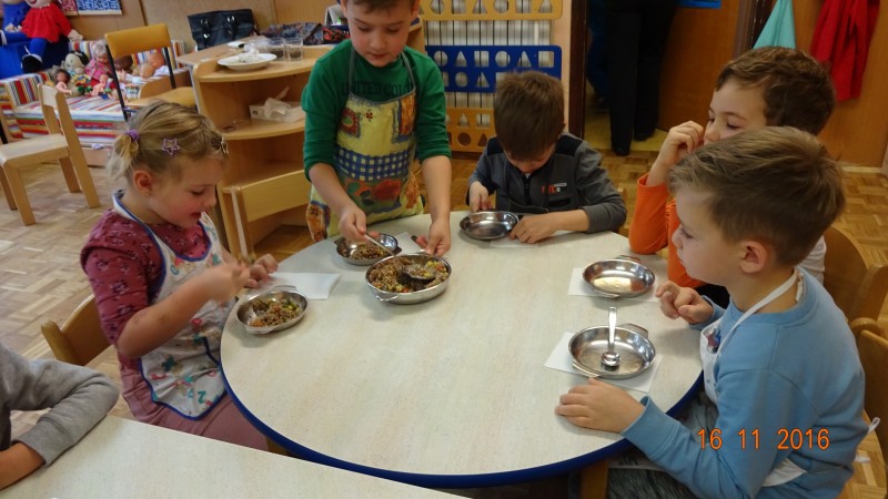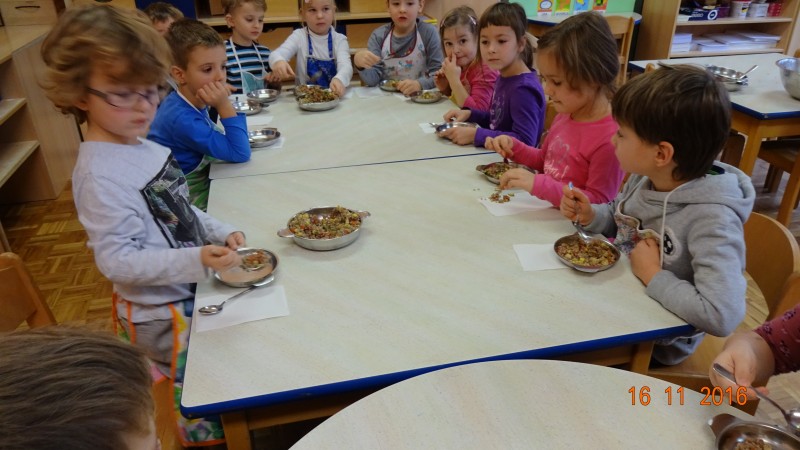Ajdo smo luščili, mleli z ročnim mlinčkom, sejali smo jo v lončke, iz slame pa smo naredili blazinico. Iz kaše pa smo si naredili solato z zelenjavo in sirom.