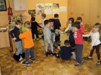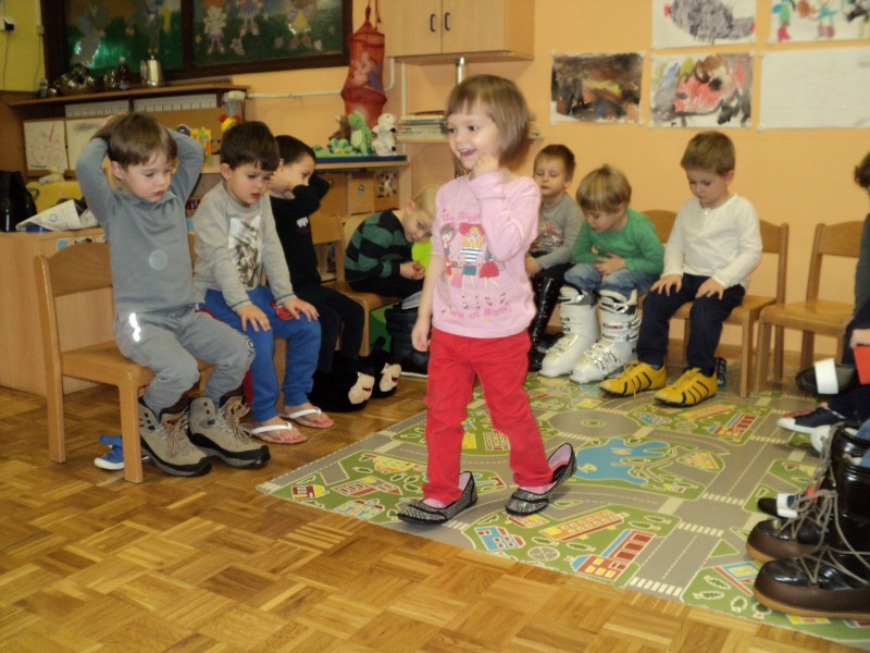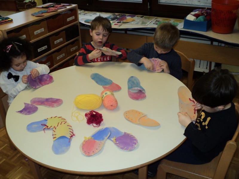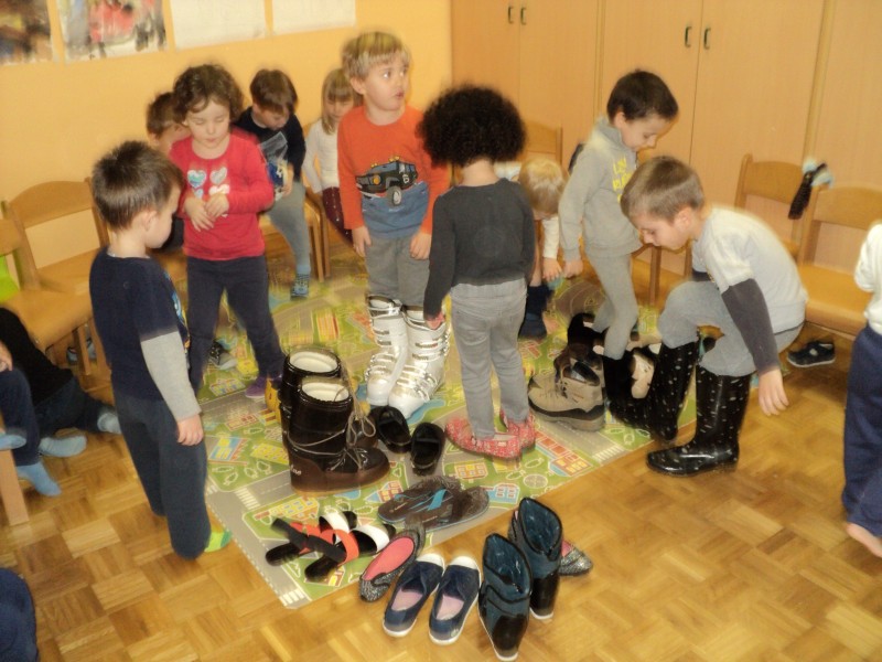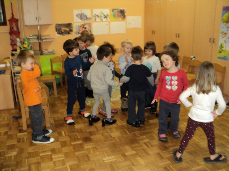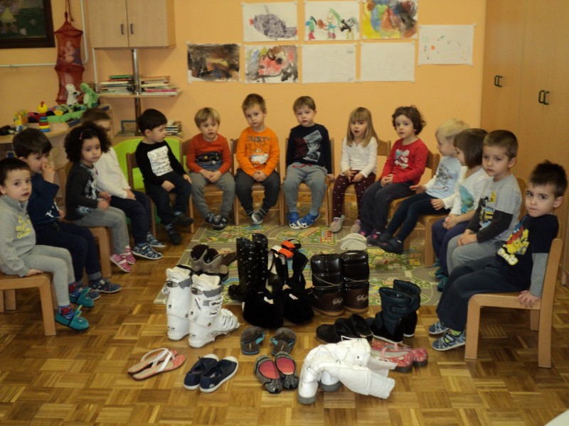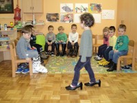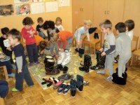 Spoznavali smo poklic čevljar, šivali copate, poslušali pravljice o čudežnih čeveljčkih in se igrali z različnimi obuvali. Z različnimi obuvali smo se predstavili na modni reviji.
