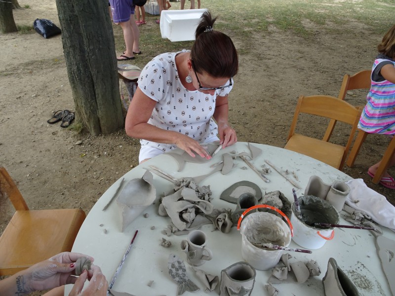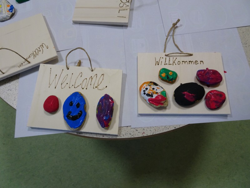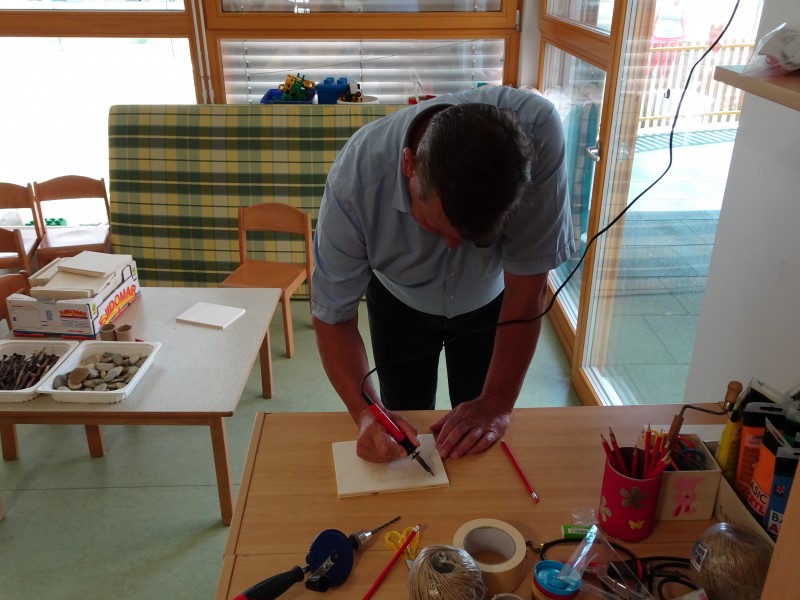 S pesmijo smo danes naredili uvod v delavnice. Otroci in odrasli smo se družili ob slikanju na steklo, izdelovanju posodic in hiške iz gline, izdelovanju table dobrodošlice, izrezovanju in sestavljanju avtomobilov, plesu in opremljanju lesa z barvami za izdelavo lovilca zvoka.