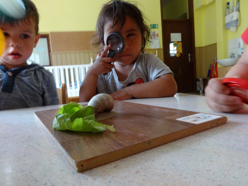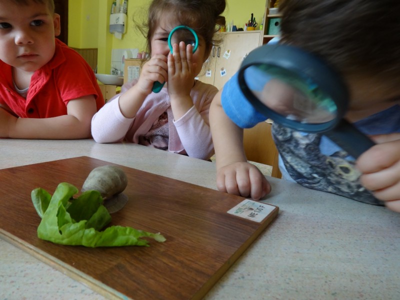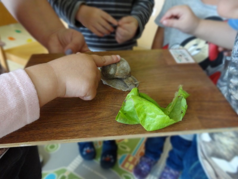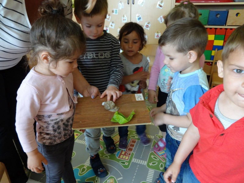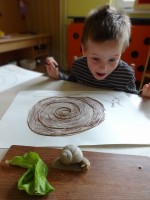 Polž je prilezel tudi v našo igralnico, imenitna priložnost, da smo ga lahko opazovali z lupami, tudi takrat ko skrije svoje tipalke. Ugotovili smo, da za seboj pušča sluzasto sled, ki ji pravimo "polžja slina".