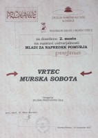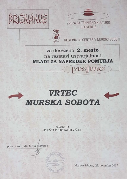Dan smo zaključili z udeležbo na slavnostni akademiji, kjer je Vrtec Murska Sobota za svoj delček k znanosti prejel priznanje, za doseženo 2. mesto na razstavi ustvarjalnosti - Mladi za napredek Pomurja.