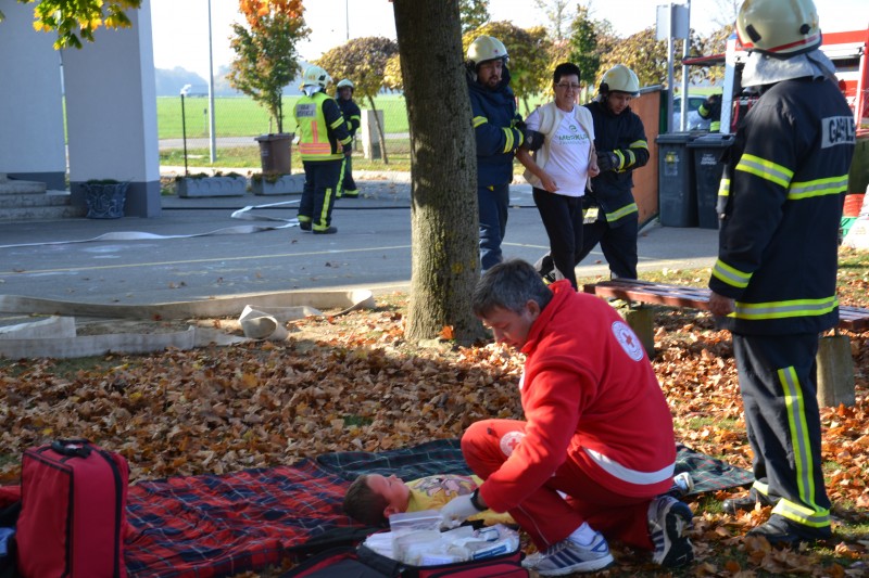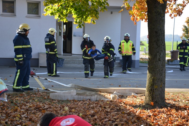 Točno ob 1000, je v enoti zapiskal požarni alarm, in pričela se je evakuacija. Na kraj je hitro po alarmu prihitela gasilka enoti PGD Pušča. Vodja, je predala informacijo, da pogrešajo štiri otroke, zato so se formirali gasilske skupine, ki so opremljene z popolno zaščitno opremo, otroke nepoškodovane prinesle do varne točke zunaj. Med tem so enote zunaj izvajale napade na gorečo stavbo in vzpostavile prostor za prvo pomoč. Seveda je šlo le za vajo, v katero so se otroci vživeli.