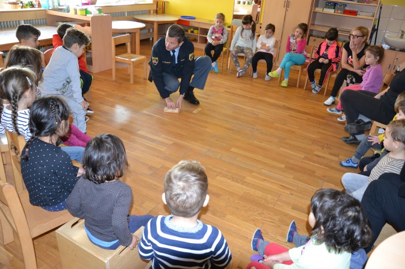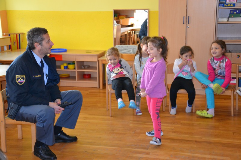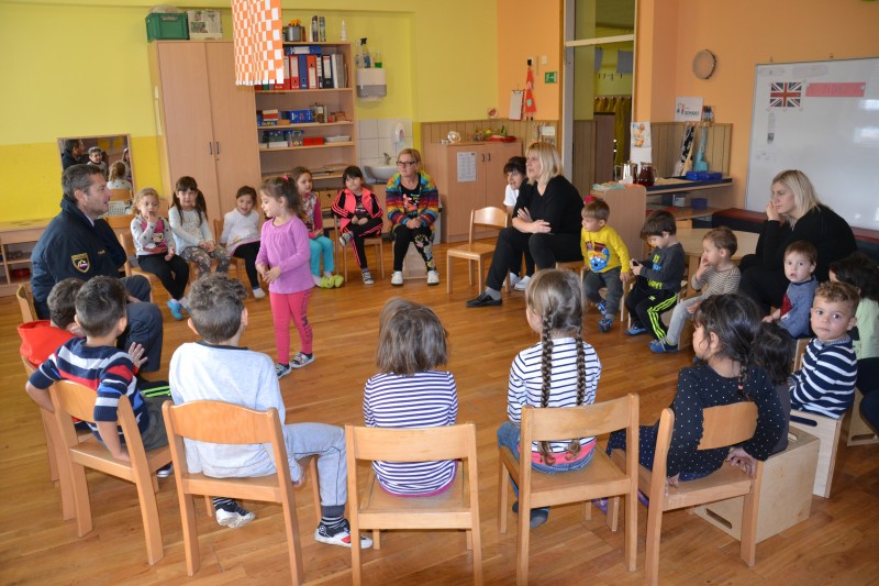 Te dni smo v vrtcu bili deležni obiska gospoda policista, ki je prišel, da bi se z nami pogovoril o varnosti v prometu. Policist nam je povedal, kako zelo je pomembno da: